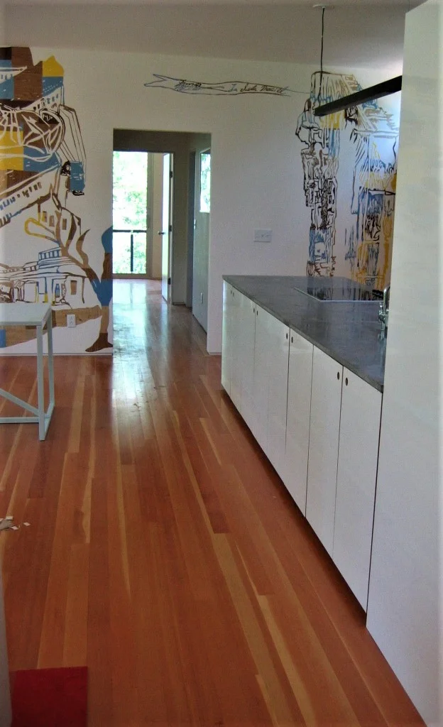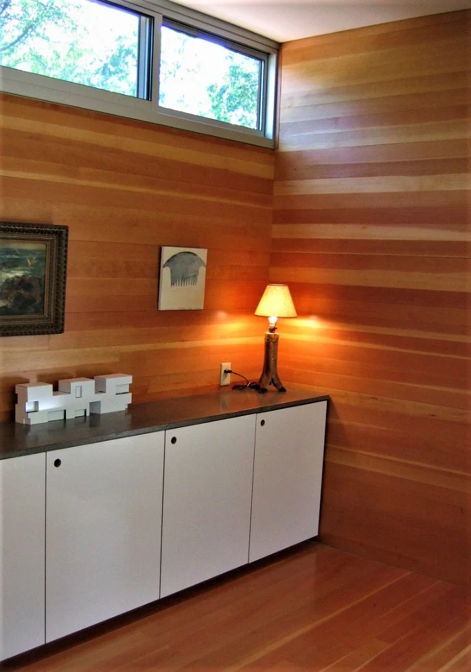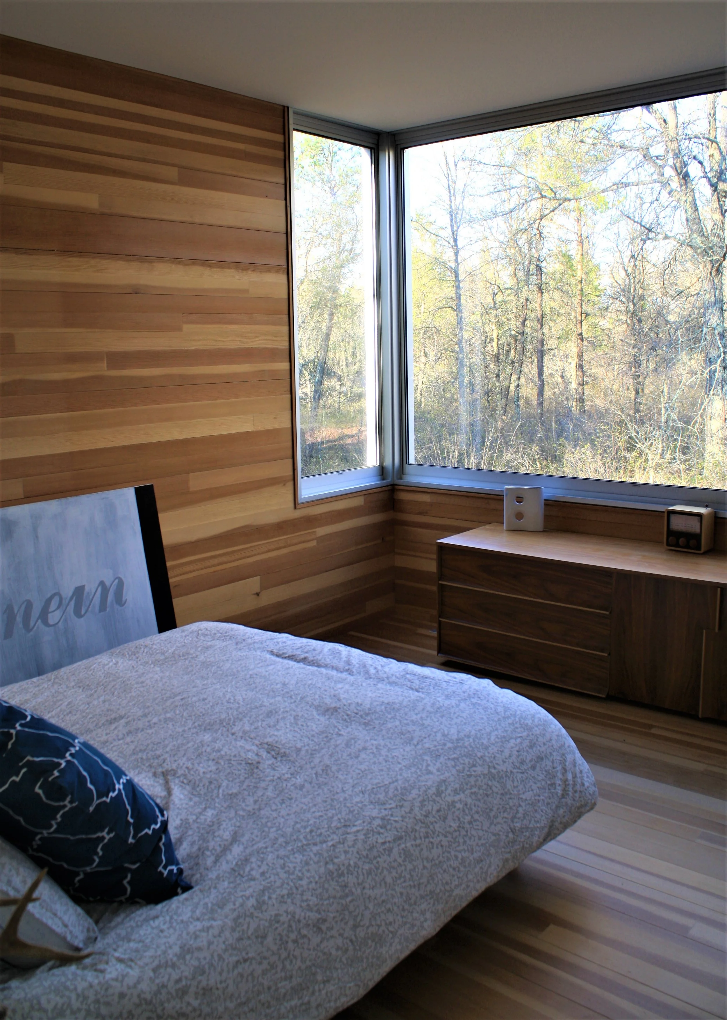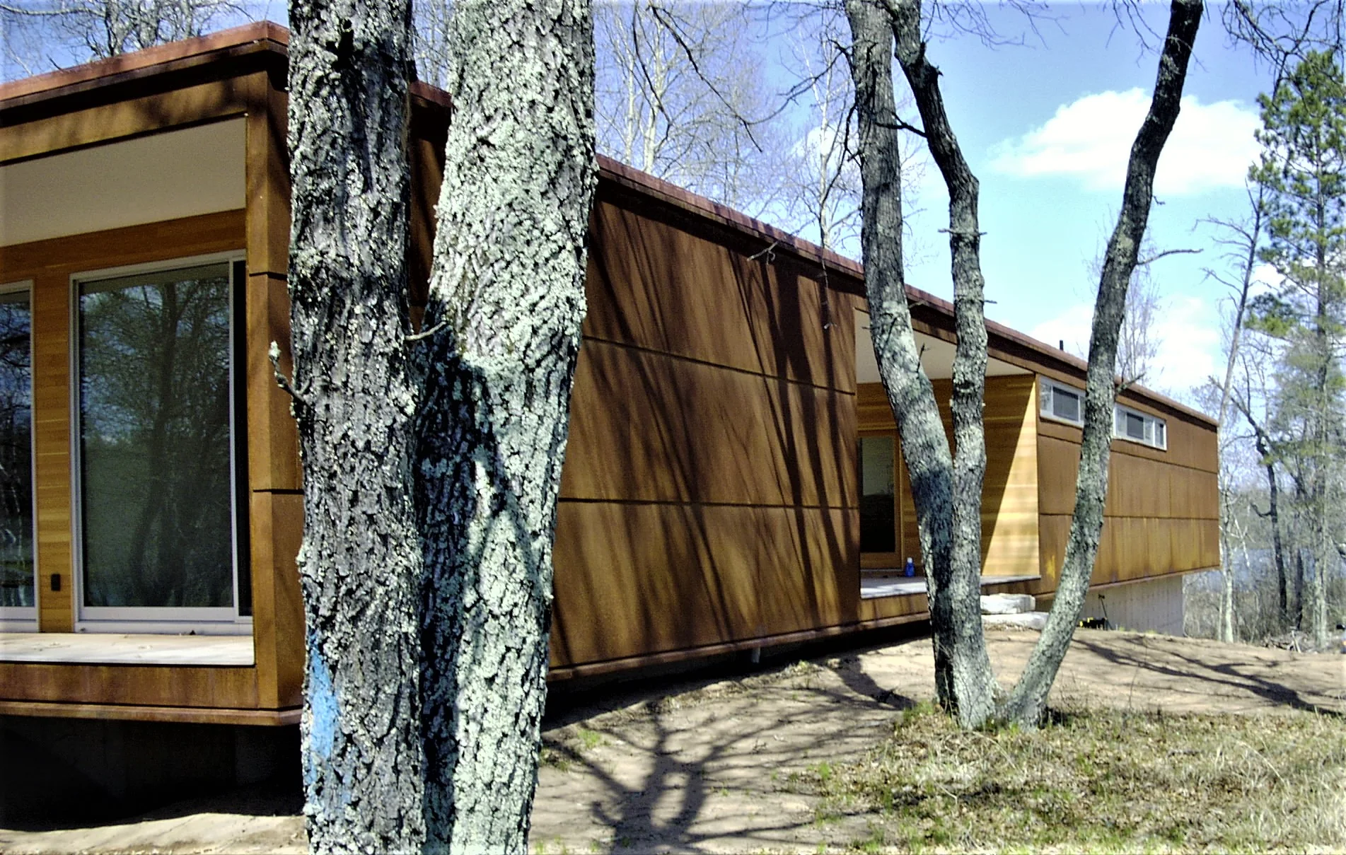 This cabin, for the founder and president of a furniture design and manufacturing company, is located on Lower Kimball Lake near Minong, Wisconsin. The main cabin was designed around a central living area and sleeping quarters with a separate but adjacent sleeping wing. The two areas are connected by a covered gathering space with a built in fire pit. A completely separate children’s bunk house is located behind the main cabin but maintains views of the lake. Both buildings are clad in Corten steel on the exterior. The interiors have fir floors and walls with floor to ceiling glass to take advantage of views. The original cabin was designed as Kampa/Danks Studio in 2003. Bunkhouse project designed by Kampa Studio in 2007.