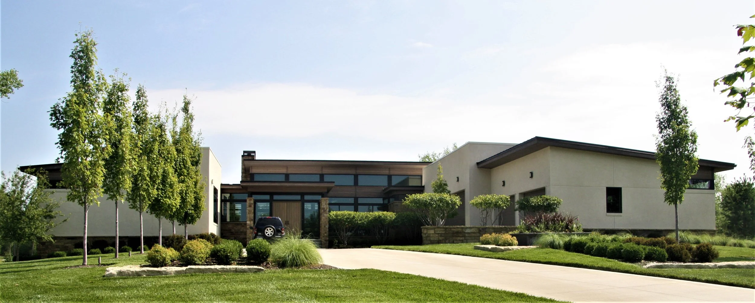 A contemporary design on a man-made lake adjacent to the Missouri River. The house has long views from the lake, a wetland area and the river. The exterior materials and colors soften the more modern aesthetic of the home. There is a covered fireplace/grill terrace that steps down to mid-level pool that leads down to a lower level lawn approach to the lake. Metal work including the fireplace cladding, mantel, vent hood and railings were built and supplied by Kampa Studio.